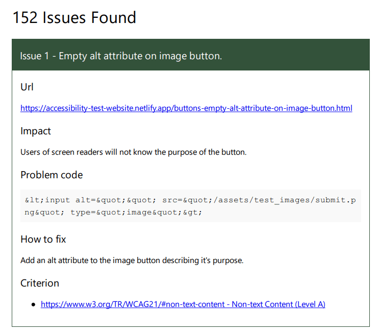 For every issue that Accessibility Reporter discovers the impact of the problem is clearly described and how you can fix it. It also provides a list of the related failed WCAG criteria and links to their relevent sections in the document.